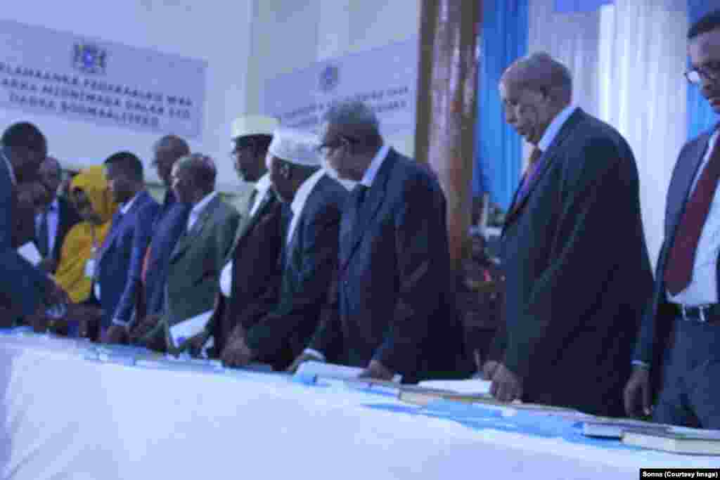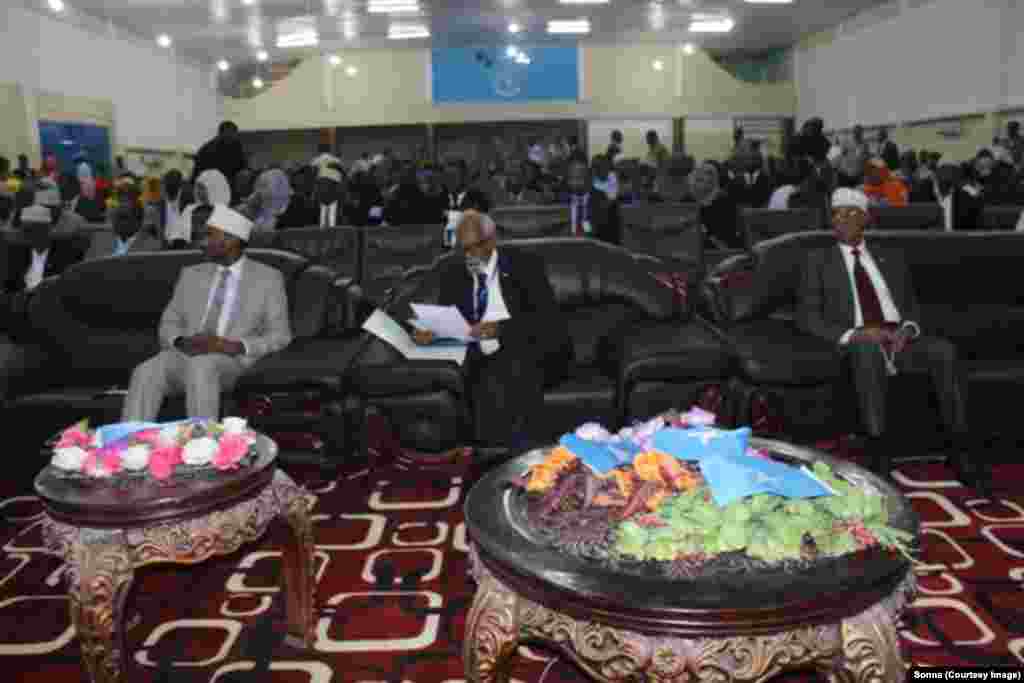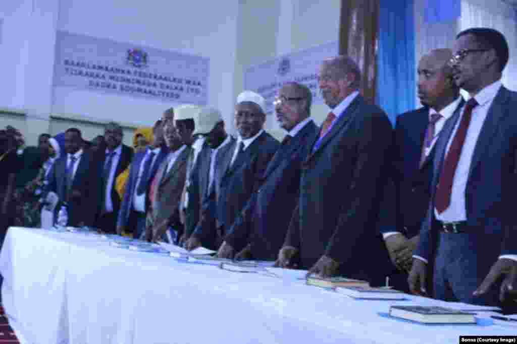 Munaasabaddii maanta ka dhacday Muqdisho ayaa lagu dhaariyey in ka badan 281 muddane oo isugu jira xubnaha Aqalada Sare iyo Hoose ee baarlamanka cusub ee Somalia, kuwaasi oo soo dooranaya afhayeenada Labada Aqal iyo Madaxweynaha cusub ee dalka.